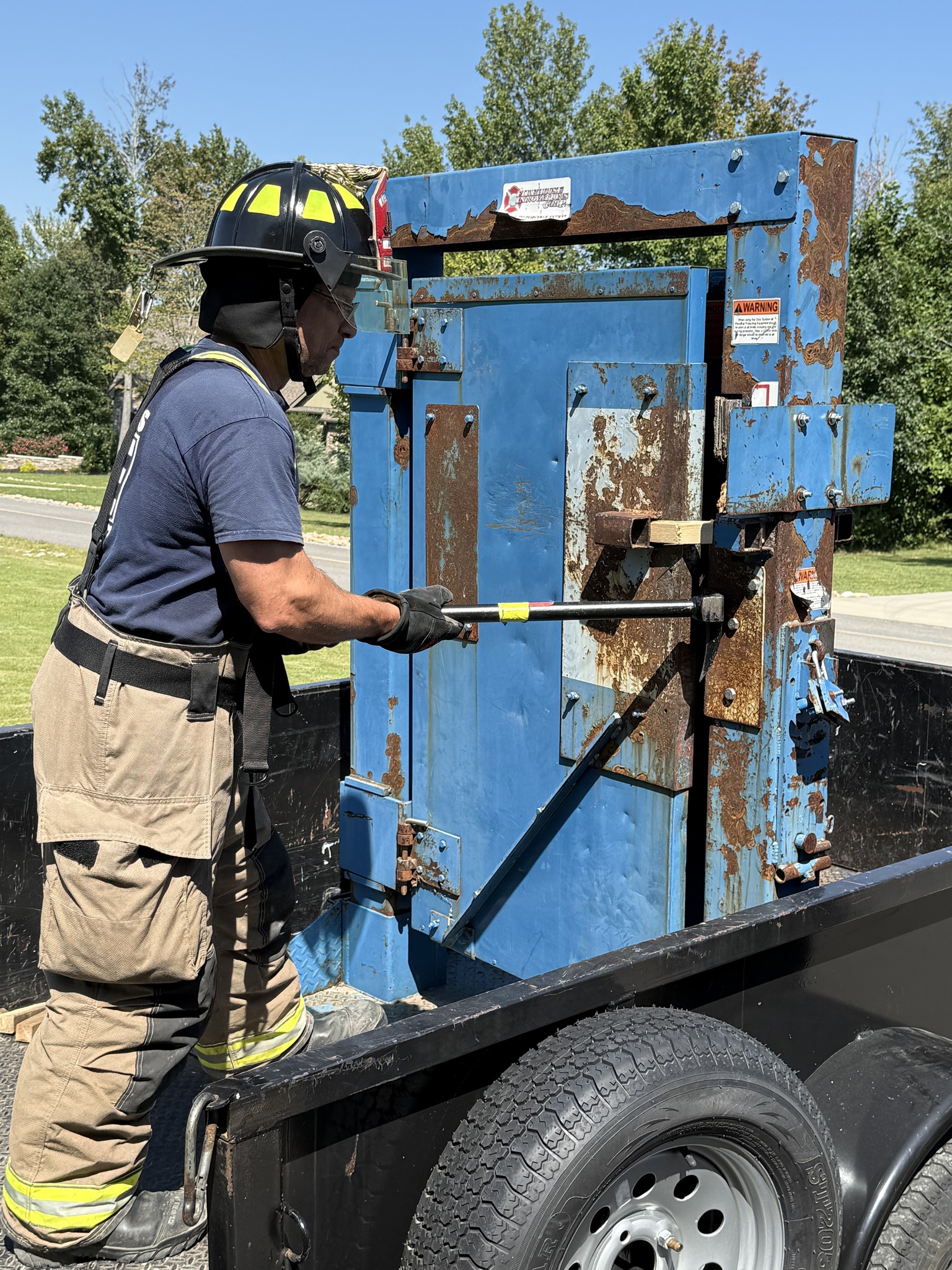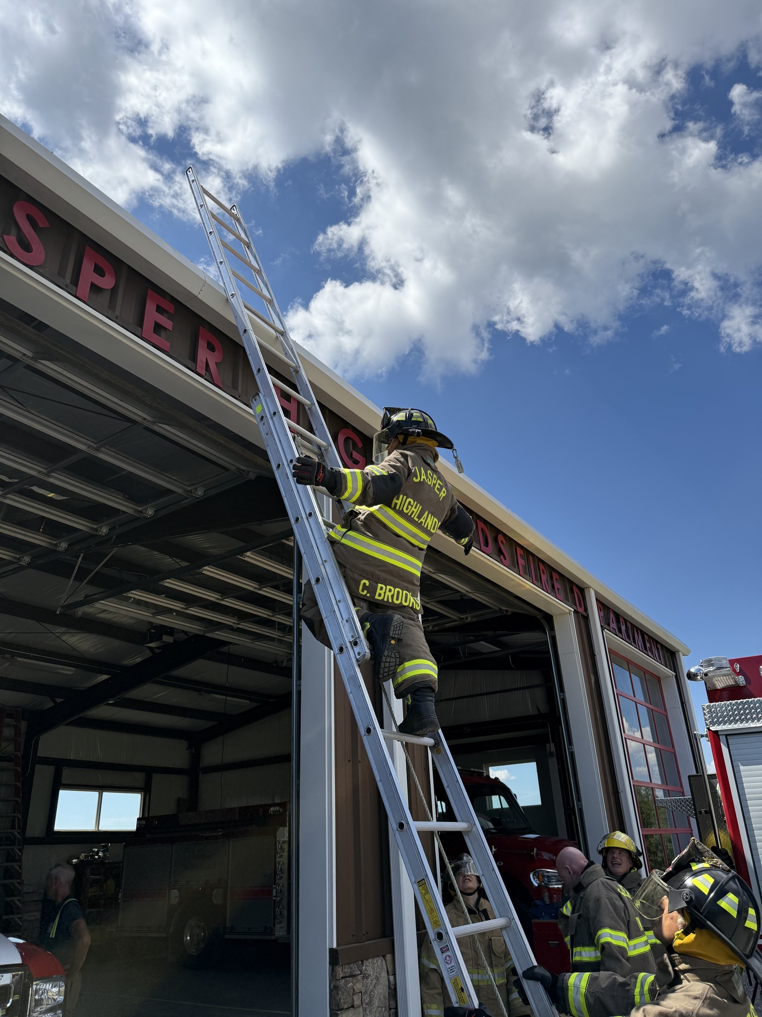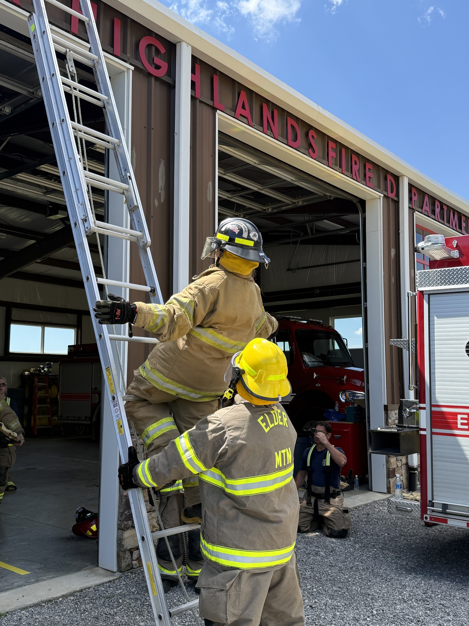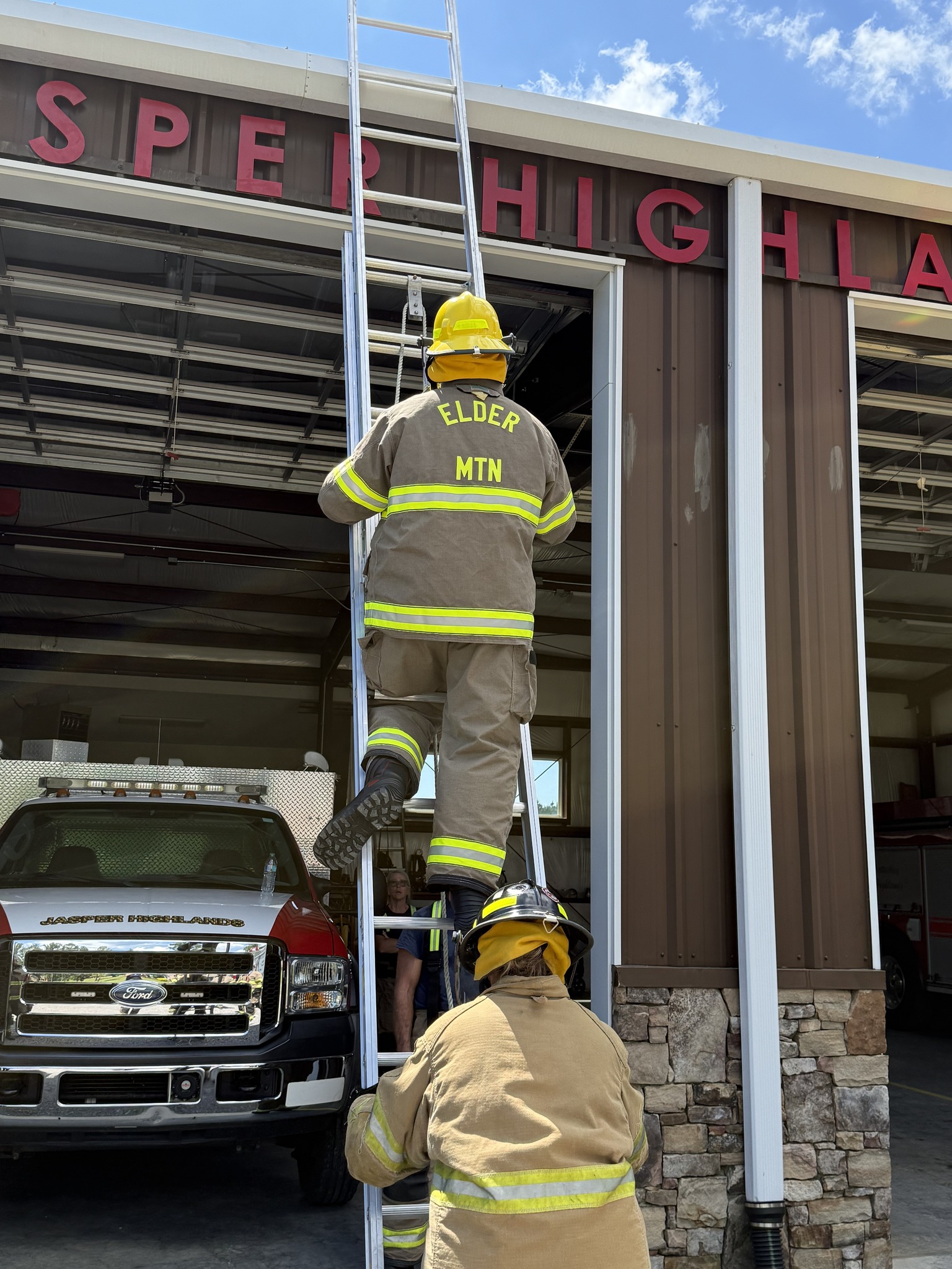 This morning’s training was a combined training session with our team and the 64-hour Intro to Firefighting class, with students from our team, Elder Mountain VFD and New Hope VFD. The morning started with a review of fire extinguishers followed by a practice session where we all extinguished a fire in our burn box. We then split into two groups with the first group doing door forcible entry training and the second group doing ladder training. Once each group completed a session, we rotated to complete the other training session. We finished a little later than usual, but the training was a valuable review for our experienced people, and a key training session for those in the 64-hour class that were exposed to these topics for the first time outside a classroom. We especially want to thank Captain Patrick Kellam and Chief Jody Clift from Hamilton County Fire Training for loaning us the forcible entry door tool. It was an outstanding training tool and we learned a lot with it. Thank you! Good job everyone!